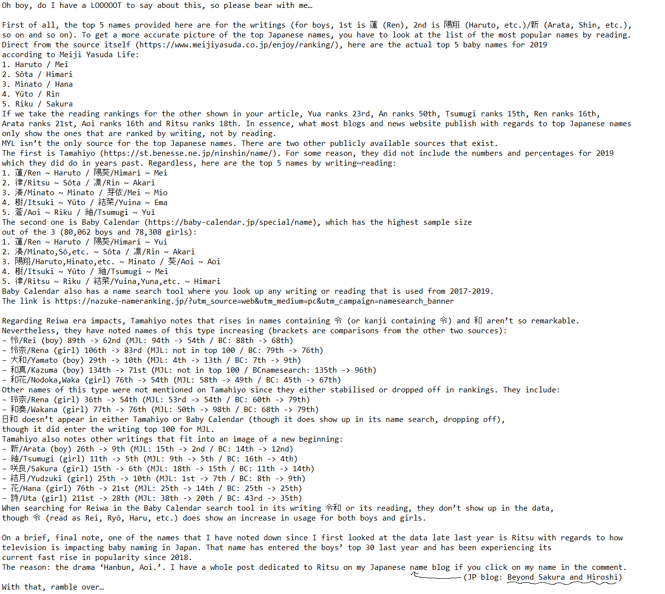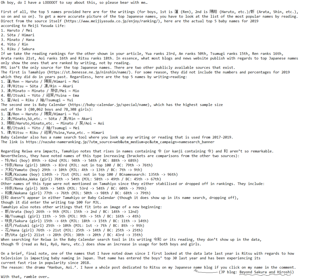 MYL isn’t the only source for the top Japanese names. There are two other publicly available sources that exist. The first is Tamahiyo (https://st.benesse.ne.jp/ninshin/name/). For some reason, they did not include the numbers and percentages for 2019 which they did do in years past. Regardless, here are the top 5 names by writing~reading:
